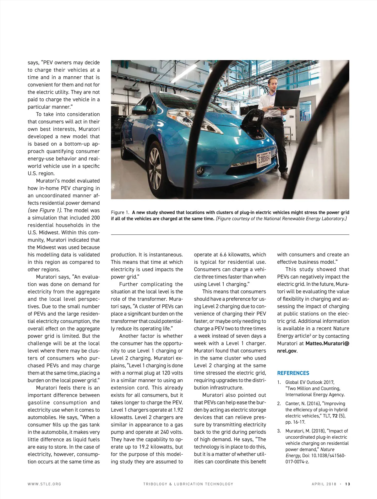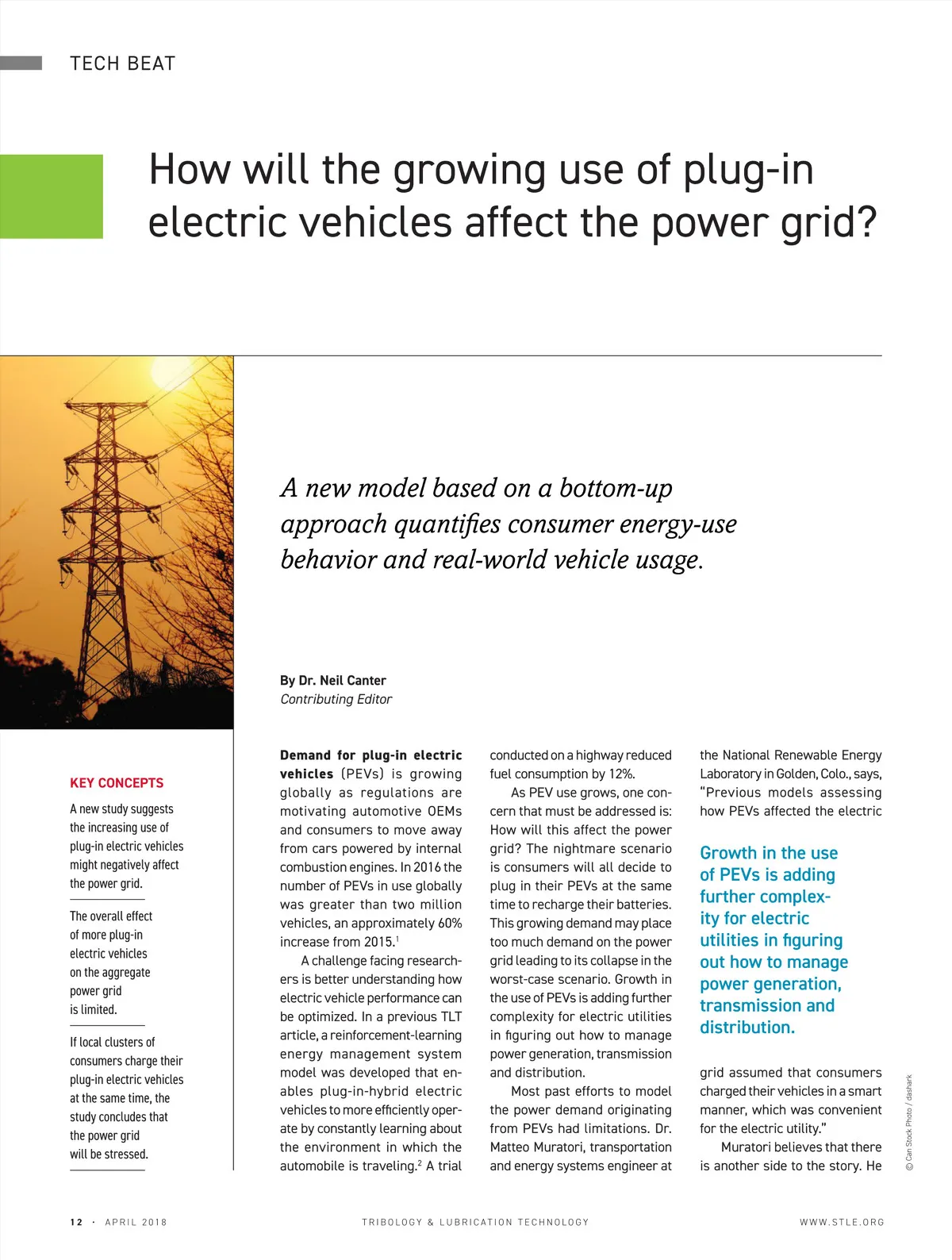 TECH BEAT How will the growing use of plug-in electric vehicles affect the power grid? A new model based on a bottom-up approach quantifies consumer energy-use behavior and real-world vehicle usage. By Dr. Neil Canter Contributing Editor KEY CONCEPTS A new study suggests the increasing use of plug-in electric vehicles might negatively affect the power grid. The overall effect of more plug-in electric vehicles on the aggregate power grid is limited. If local clusters of consumers charge their plug-in electric vehicles at the same time, the study concludes that the power grid will be stressed. Demand for plug-in electric vehicles (PEVs) is growing globally as regulations are motivating automotive OEMs and consumers to move away from cars powered by internal combustion engines. In 2016 the number of PEVs in use globally was greater than two million vehicles, an approximately 60% increase from 2015. 1 A challenge facing research-ers is better understanding how electric vehicle performance can be optimized. In a previous TLT article, a reinforcement-learning energy management system model was developed that en-ables plug-in-hybrid electric vehicles to more efficiently oper-ate by constantly learning about the environment in which the automobile is traveling. 2 A trial conducted on a highway reduced fuel consumption by 12%. As PEV use grows, one con-cern that must be addressed is: How will this affect the power grid? The nightmare scenario is consumers will all decide to plug in their PEVs at the same time to recharge their batteries. This growing demand may place too much demand on the power grid leading to its collapse in the worst-case scenario. Growth in the use of PEVs is adding further complexity for electric utilities in figuring out how to manage power generation, transmission and distribution. Most past efforts to model the power demand originating from PEVs had limitations. Dr. Matteo Muratori, transportation and energy systems engineer at the National Renewable Energy Laboratory in Golden, Colo., says, “Previous models assessing how PEVs affected the electric Growth in the use of PEVs is adding further complex-ity for electric utilities in figuring out how to manage power generation, transmission and distribution. grid assumed that consumers charged their vehicles in a smart manner, which was convenient for the electric utility.” Muratori believes that there is another side to the story. He © Can Stock Photo / dashark 12 • APRIL 2018 TRIBOLOGY & LUBRICATION TECHNOLOGY WWW.STLE.ORG