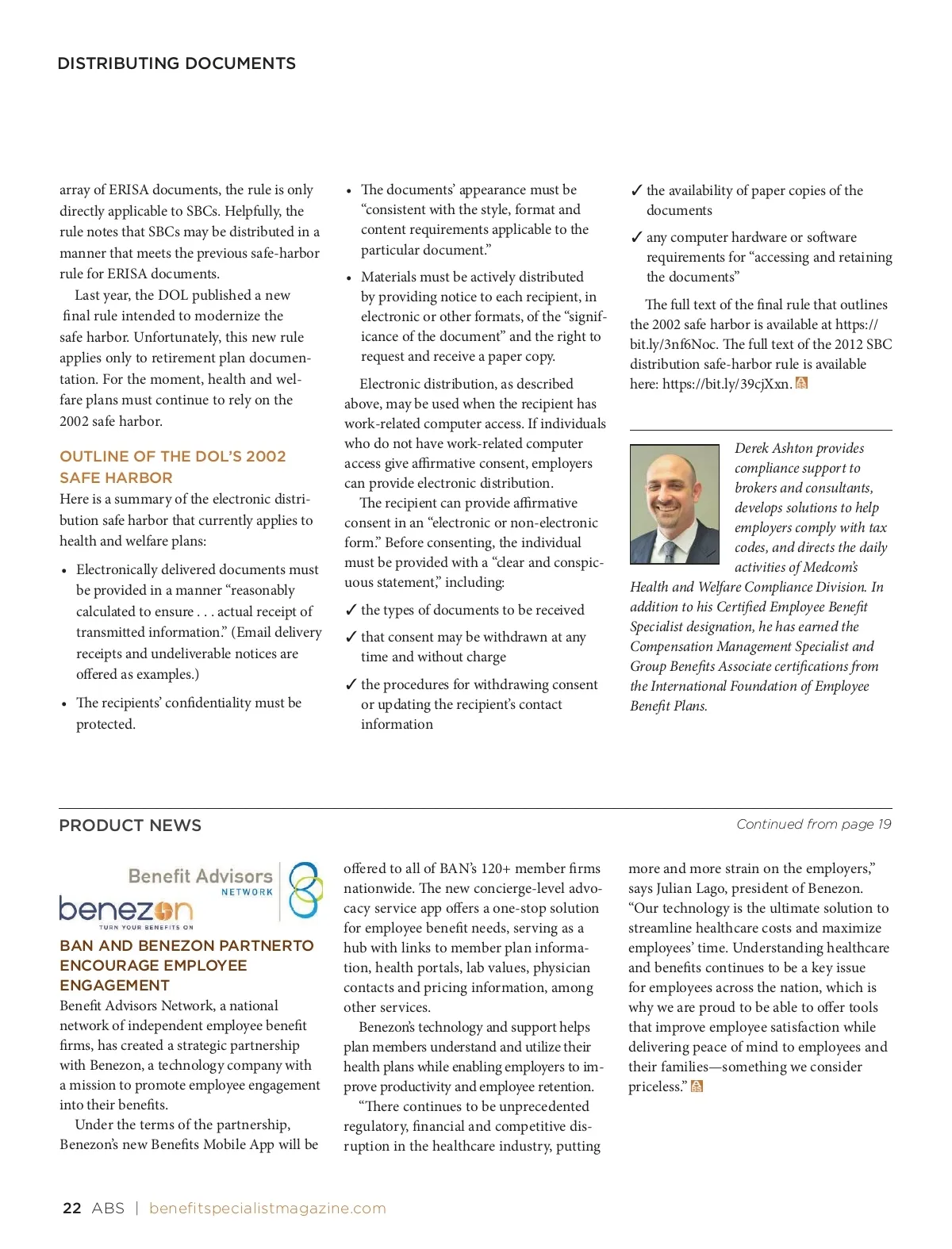 DISTRIBUTING DOCUMENTS array of ERISA documents, the rule is only directly applicable to SBCs. Helpfully, the rule notes that SBCs may be distributed in a manner that meets the previous safe-harbor rule for ERISA documents. Last year, the DOL published a new fi nal rule intended to modernize the safe harbor. Unfortunately, this new rule applies only to retirement plan documen-tation. For the moment, health and wel-fare plans must continue to rely on the 2002 safe harbor. OUTLINE OF THE DOL’S 2002 SAFE HARBOR Here is a summary of the electronic distri-bution safe harbor that currently applies to health and welfare plans: • Electronically delivered documents must be provided in a manner “reasonably calculated to ensure . . . actual receipt of transmitted information.” (Email delivery receipts and undeliverable notices are off ered as examples.) • Th e recipients’ confi dentiality must be protected. • Th e documents’ appearance must be “consistent with the style, format and content requirements applicable to the particular document.” • Materials must be actively distributed by providing notice to each recipient, in electronic or other formats, of the “signif-icance of the document” and the right to request and receive a paper copy. Electronic distribution, as described above, may be used when the recipient has work-related computer access. If individuals who do not have work-related computer access give affi rmative consent, employers can provide electronic distribution. Th e recipient can provide affi rmative consent in an “electronic or non-electronic form.” Before consenting, the individual must be provided with a “clear and conspic-uous statement,” including:  the types of documents to be received  that consent may be withdrawn at any time and without charge  the procedures for withdrawing consent or updating the recipient’s contact information  the availability of paper copies of the documents  any computer hardware or soft ware requirements for “accessing and retaining the documents” Th e full text of the fi nal rule that outlines the 2002 safe harbor is available at https:// bit.ly/3nf6Noc. Th e full text of the 2012 SBC distribution safe-harbor rule is available here: https://bit.ly/39cjXxn. Derek Ashton provides compliance support to brokers and consultants, develops solutions to help employers comply with tax codes, and directs the daily activities of Medcom’s Health and Welfare Compliance Division. In addition to his Certifi ed Employee Benefi t Specialist designation, he has earned the Compensation Management Specialist and Group Benefi ts Associate certifi cations from the International Foundation of Employee Benefi t Plans. PRODUCT NEWS off ered to all of BAN’s 120+ member fi rms nationwide. Th e new concierge-level advo-cacy service app off ers a one-stop solution for employee benefi t needs, serving as a hub with links to member plan informa-tion, health portals, lab values, physician contacts and pricing information, among other services. Benezon’s technology and support helps plan members understand and utilize their health plans while enabling employers to im-prove productivity and employee retention. “Th ere continues to be unprecedented regulatory, fi nancial and competitive dis-ruption in the healthcare industry, putting Continued from page 19 BAN AND BENEZON PARTNERTO ENCOURAGE EMPLOYEE ENGAGEMENT Benefi t Advisors Network, a national network of independent employee benefi t fi rms, has created a strategic partnership with Benezon, a technology company with a mission to promote employee engagement into their benefi ts. Under the terms of the partnership, Benezon’s new Benefi ts Mobile App will be more and more strain on the employers,” says Julian Lago, president of Benezon. “Our technology is the ultimate solution to streamline healthcare costs and maximize employees’ time. Understanding healthcare and benefi ts continues to be a key issue for employees across the nation, which is why we are proud to be able to off er tools that improve employee satisfaction while delivering peace of mind to employees and their families—something we consider priceless.” 22 ABS | benefitspecialistmagazine.com